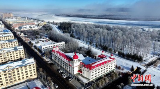 5日,黑龙江省大兴安岭呼玛县迎来今冬首场雾凇奇观。中俄界江黑龙江呼玛镇江段雾霭升腾,江畔树木凝结起晶莹冰晶,与江面上缓缓流动的冰排相互映衬,构成一幅绝美的冬日图景,吸引众多游客和当地居民驻足观赏。