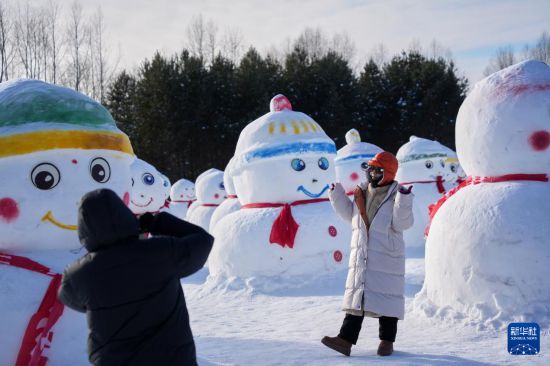 1月29日,游客在漠河北极村景区内的北极沙洲与雪人“矩阵”合影。 冬日里,在有着“神州北极”之称的黑龙江省漠河市,冰雪旅游市场持续走热,游客纷至沓来。