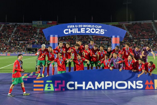 19日在智利首都圣地亚哥举行的2025国际足联U20男足世界杯决赛中,摩洛哥队以2:0击败阿根廷队夺得冠军,创造球队历史。 10月19日,摩洛哥队在颁奖仪式上。