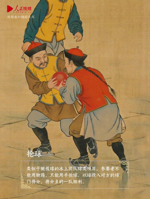 残冬未褪,春寒料峭 太液池冰面似镜,百顷无瑕 忽闻金鼓乍响,但见旌旗翻飞 一场冰上盛会即将上演! 咻~ 一颗球如流星划过天空 两队人马争先恐后,前追后截 这一刻,争抢的不仅是手上的球 更是顷刻间的心跳 迎面如龙形般蜿蜒而来的 百人队伍好不壮观! 定睛一看 “大蝎子”“冰上侧翻” “飞燕式”“童子拜佛” 表演者各显神通 真看得人眼花缭乱 他们或身负旌旗,或手持弓箭 “龙身”盘旋一回,速度骤起 只见队尾持弓箭者 在滑过旌门的瞬间 回身拉满雕弓 银箭直取天球! 砰!一声爆竹声响 抢等比赛拉开了序幕 耳旁朔风猎猎作响 又是一份冰上的速度与激情! 冰雪炽燃 运动在线 趁着暖阳正好 开动! 《冰嬉图》(清)金昆、程志道、福隆安等.
