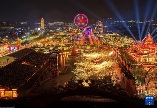 2月20日,民间艺人在河北省唐山市丰南区河头老街为游客表演“打树花”(无人机照片)。 春节期间,河北省唐山市丰南区河头老街灯火璀璨、火树银花,为游客呈现出一场流光溢彩的视觉盛宴。