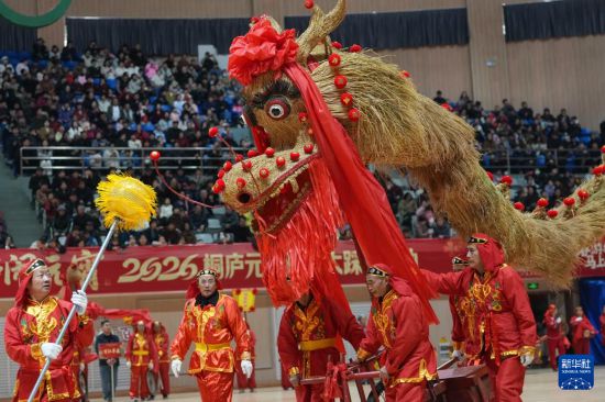 2月28日,桐庐县百江镇草龙在江南体育馆巡游表演。 2月28日,桐庐县深澳高空狮子表演队在桐庐县中心广场巡游表演。