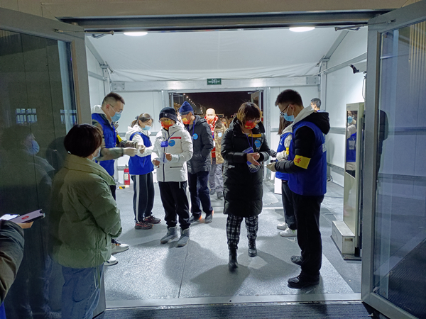 为做好测试赛的疫情防控工作,观众进场时需要出示北京健康宝绿码和大数据行程卡绿码。在完成测温之后,观众通过专门的进场流线步行进入观赛区域,该区域与场馆工作人员、运动员等其他客户群体空间不接触、流线不交叉,保证区域安全。此外在场馆的检票口、观众看台、取暖区等观众易聚集区域均设置了防疫物资摆放台,观众可以随时领取必要的防疫物资。