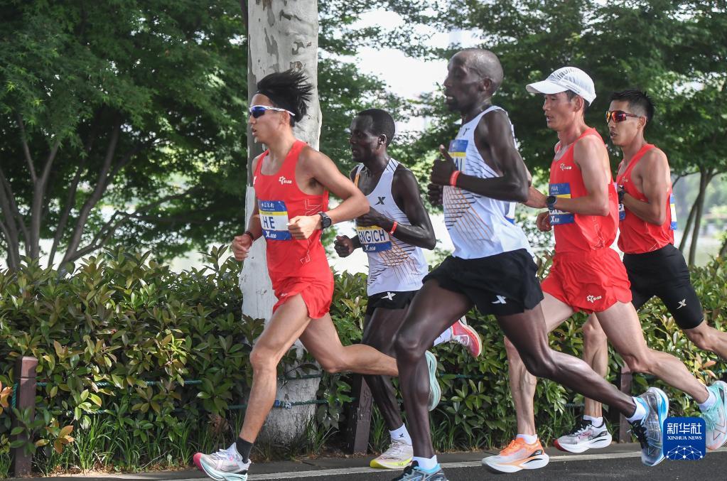4月16日,中国选手何杰(左一)在比赛中经过武汉东湖绿道。最终,他以2小时12分35秒的成绩获得2023武汉马拉松比赛全程马拉松项目男子组冠军。新华社记者 程敏 摄