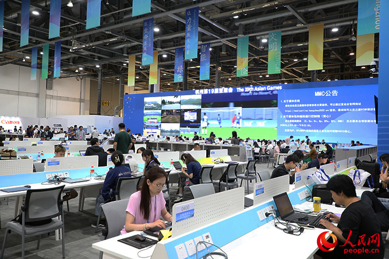 人民网杭州9月21日电 杭州第19届亚运会将于9月23日开幕,媒体记者们已经忙碌起来,人民网记者带您一起走进主媒体中心。(人民网记者李乃妍摄影报道)