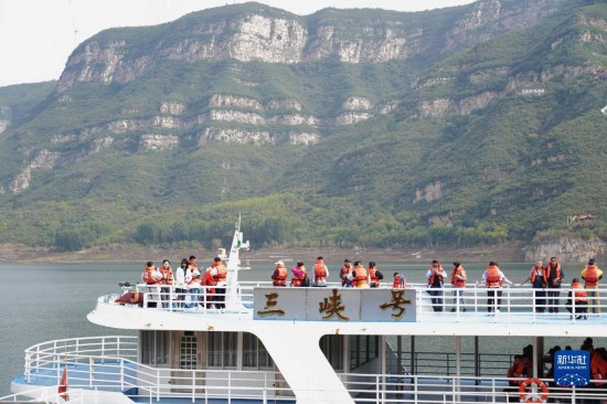 10月8日,游客乘船游览河南济源黄河三峡景区。