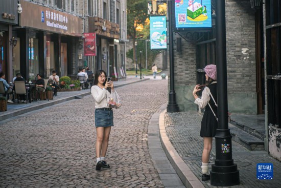 10月31日,游客在宁波老外滩步行街拍照。