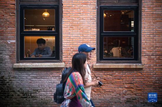 10月31日,游客经过宁波老外滩步行街一处由历史建筑改造而成的咖啡厅。