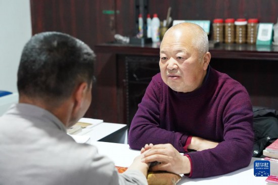 11月9日,在安徽省黄山市歙县深渡镇定潭村“张一帖内科疗法”诊所,李梃(右)为村民问诊。