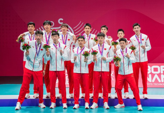 9月26日,在杭州亚运会男子排球决赛中,中国队以1比3不敌伊朗队,获得亚军。新华社记者 孙非 摄