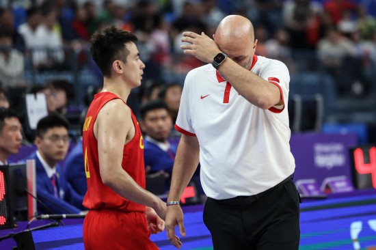 10月4日,中国队主教练乔尔杰维奇(右)在比赛后。当日,在杭州亚运会篮球项目男子半决赛中,中国队以76比77负于菲律宾队,无缘决赛。 新华社记者 潘昱龙 摄