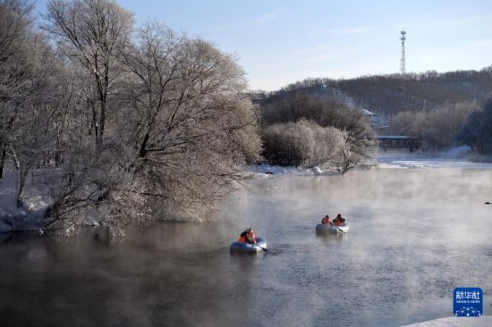 冬日,黑龙江省五大连池市山口湖景区出现雾凇景观,游客一边体验漂流,一边欣赏雾凇美景。