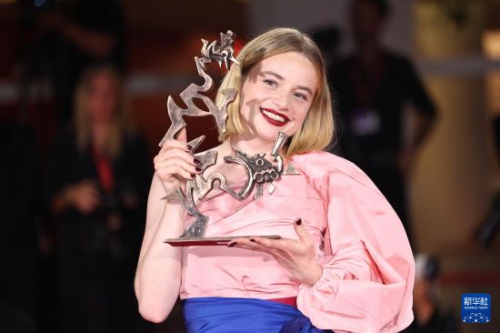 9月6日,在意大利威尼斯,最佳新演员奖获得者、电影《寂静的朋友》演员卢娜·韦德勒与奖杯合影。