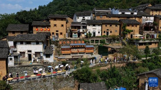 时值秋收时节,村民们利用晴好天气,将辣椒、玉米、山核桃等农作物晾晒在房前屋后,形成独具特色的“晒秋”景观。