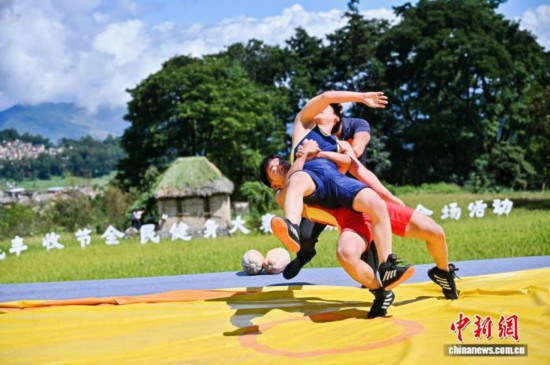 10月3日,“哈尼梯田民族跤王赛”比赛现场。施绍斌 摄