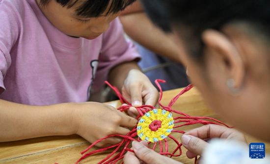 10月12日,在海南省文化馆,小朋友学习东山草编技艺。