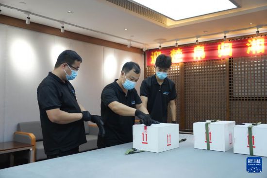 9月11日,工作人员在湖南省博物馆打开装有长沙子弹库战国帛书的箱子准备核验。