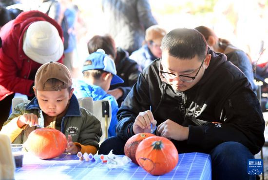 11月2日,游客在北京世界花卉大观园体验南瓜涂鸦。