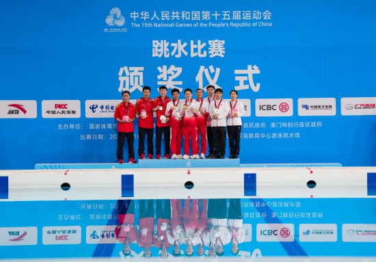 11月6日,冠军广东队组合黄博文/谢思埸(中)、亚军江苏队组合刘成铭/朱涵(左)与季军山西队组合李政/梁朝辉在颁奖仪式上与教练合影。当日,第十五届全国运动会跳水男子双人3米跳板决赛在广州市举行。新华社记者 晋美多吉 摄