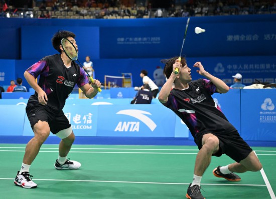 11月12日,浙江队组合王昶(右)/谢浩南在男双比赛中回球。新华社记者 李紫恒 摄