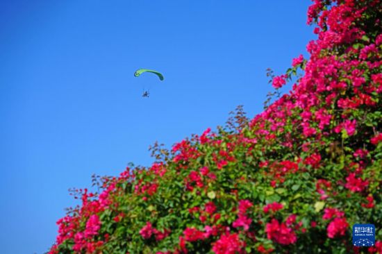 11月15日,动力伞爱好者在广西南宁市青秀山风景区三角梅旁飞过。