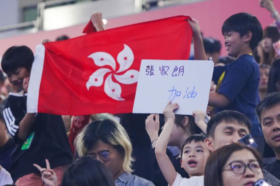 11月16日,观众在现场为香港队选手张家朗加油。新华社记者 朱炜 摄