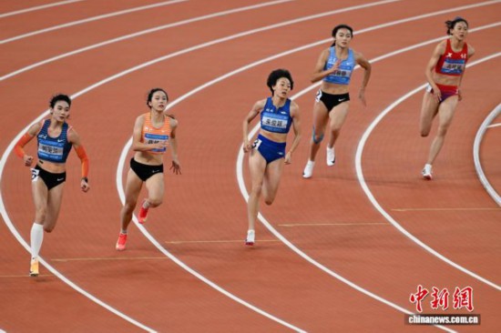 11月19日晚,广东奥林匹克体育中心,浙江队选手陈妤颉(左2)正在参加十五运会田径项目女子200米决赛。中新社记者 陈楚红 摄