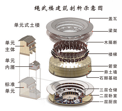 漳州市平和县绳武楼建筑剖析示意图。 |