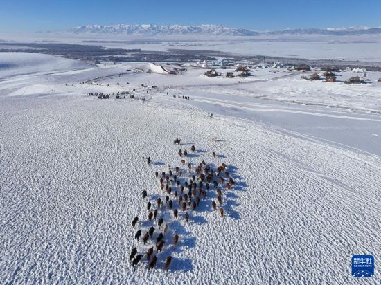 这是1月3日在新疆昭苏湿地公园拍摄的“天马踏雪”表演(无人机照片)。