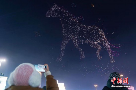 第42届中国·哈尔滨国际冰雪节于1月5日晚在冰雪大世界开幕,无人机灯光秀点亮夜空。 赵宇航 摄