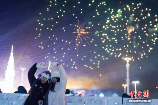 第42届中国·哈尔滨国际冰雪节于1月5日晚在冰雪大世界开幕,游客欣赏焰火表演。 赵宇航 摄