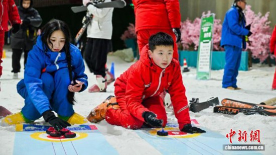 小朋友在浙江温州文成县一室内滑雪场体验冰壶。戚款 摄