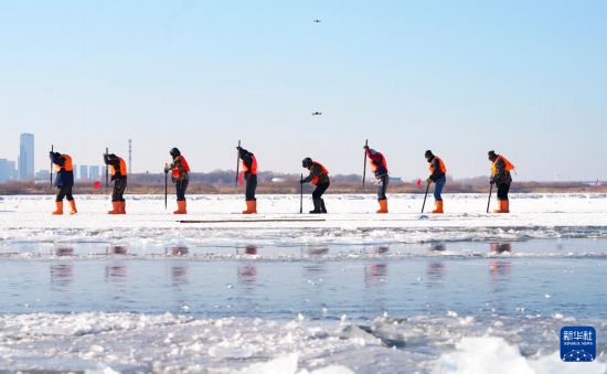 2025年12月9日,工人在松花江哈尔滨段江面上进行采冰作业。