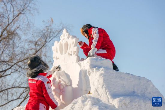 1月7日,在哈尔滨太阳岛雪博会第28届中国·哈尔滨国际雪雕比赛现场,选手在进行雪雕创作。
