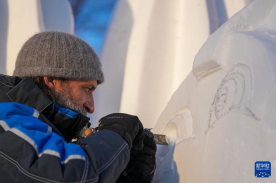 1月7日,在哈尔滨太阳岛雪博会园区,来自13个国家的25支代表队百余位艺术家在寒冬中坚持艺术创作,精雕细琢雪雕作品。