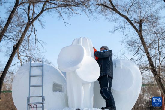 1月7日,在哈尔滨太阳岛雪博会园区,来自13个国家的25支代表队百余位艺术家在寒冬中坚持艺术创作,精雕细琢雪雕作品。