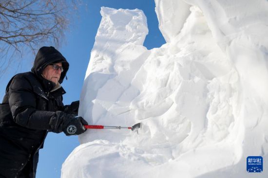 1月7日,在哈尔滨太阳岛雪博会园区,来自13个国家的25支代表队百余位艺术家在寒冬中坚持艺术创作,精雕细琢雪雕作品。