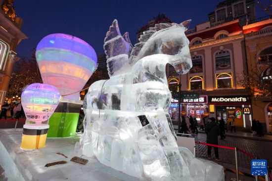 哈尔滨:冰雕景观为百年中央大街添彩