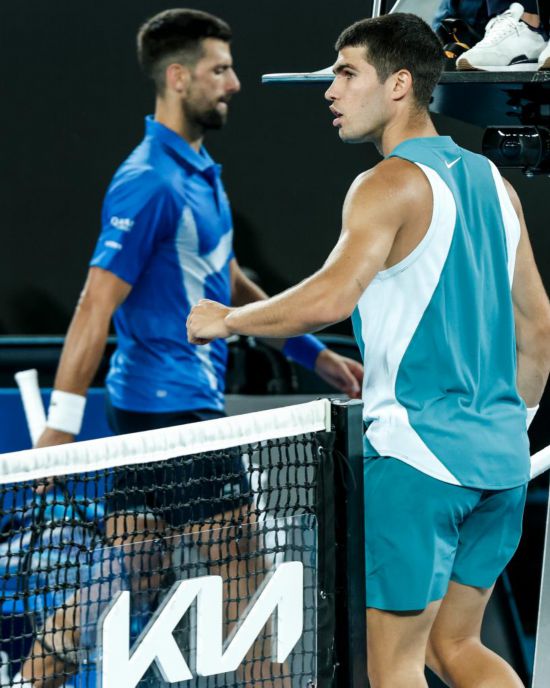 2025年1月21日,阿尔卡拉斯(右)与焦科维奇在比赛间隙。当日,在墨尔本进行的2025年澳大利亚网球公开赛男单四分之一决赛中,塞尔维亚选手焦科维奇3:1战胜西班牙选手阿尔卡拉斯,晋级四强。新华社记者 马平 摄