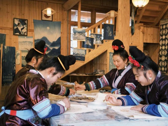 1月15日,陆勇妹(右二)正在和绣娘们一同画蜡。新华社记者 周宣妮 摄