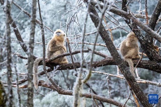 1月19日,两只金丝猴在神农架国家公园大龙潭金丝猴野外研究基地树枝上休憩。