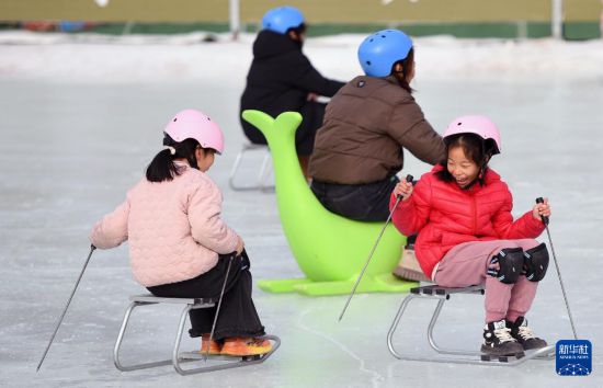 1月28日,在北京市平谷区镇罗营镇湖畔耕读园,游客在活动现场滑冰车。