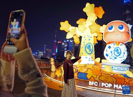 2月1日晚,游客在BFC外滩金融中心露台上的灯组前留影。