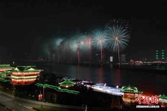 2月17日,正值农历大年初一,2026年南昌市迎春烟花晚会在“赣江之心”老官洲举行,赣江江畔火树银花,绚烂烟花绽放夜空。 刘思伟 摄