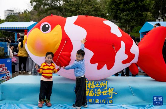 2月25日,在2026年“福州金鱼城市移动会客厅”活动现场,小朋友在充气卡通金鱼前打卡留影。