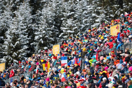 2月18日,观众在观看冬季两项女子4X6公里接力比赛。新华社记者 张涛 摄
