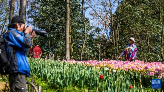 近日,贵州省黔南布依族苗族自治州龙里县龙架山国家森林公园内的数万株郁金香竞相绽放,吸引各地游客前来游玩赏景。