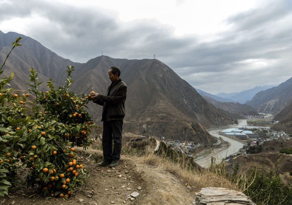 3月2日,田济明在山顶上的柑橘园里查看柑橘生长情况。