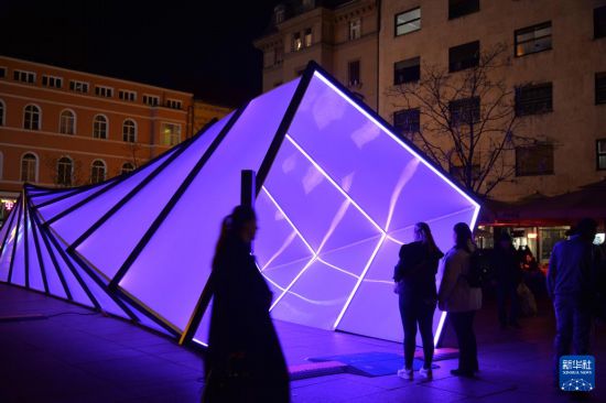 3月18日,人们在克罗地亚首都萨格勒布鲜花广场欣赏灯光艺术装置。