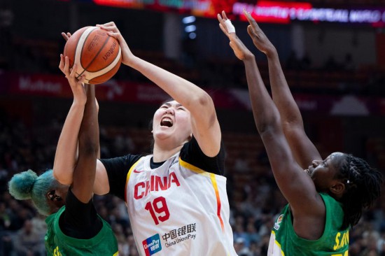 ↑3月14日,中国队球员王思雨(中)在比赛中上篮。新华社记者肖艺九摄